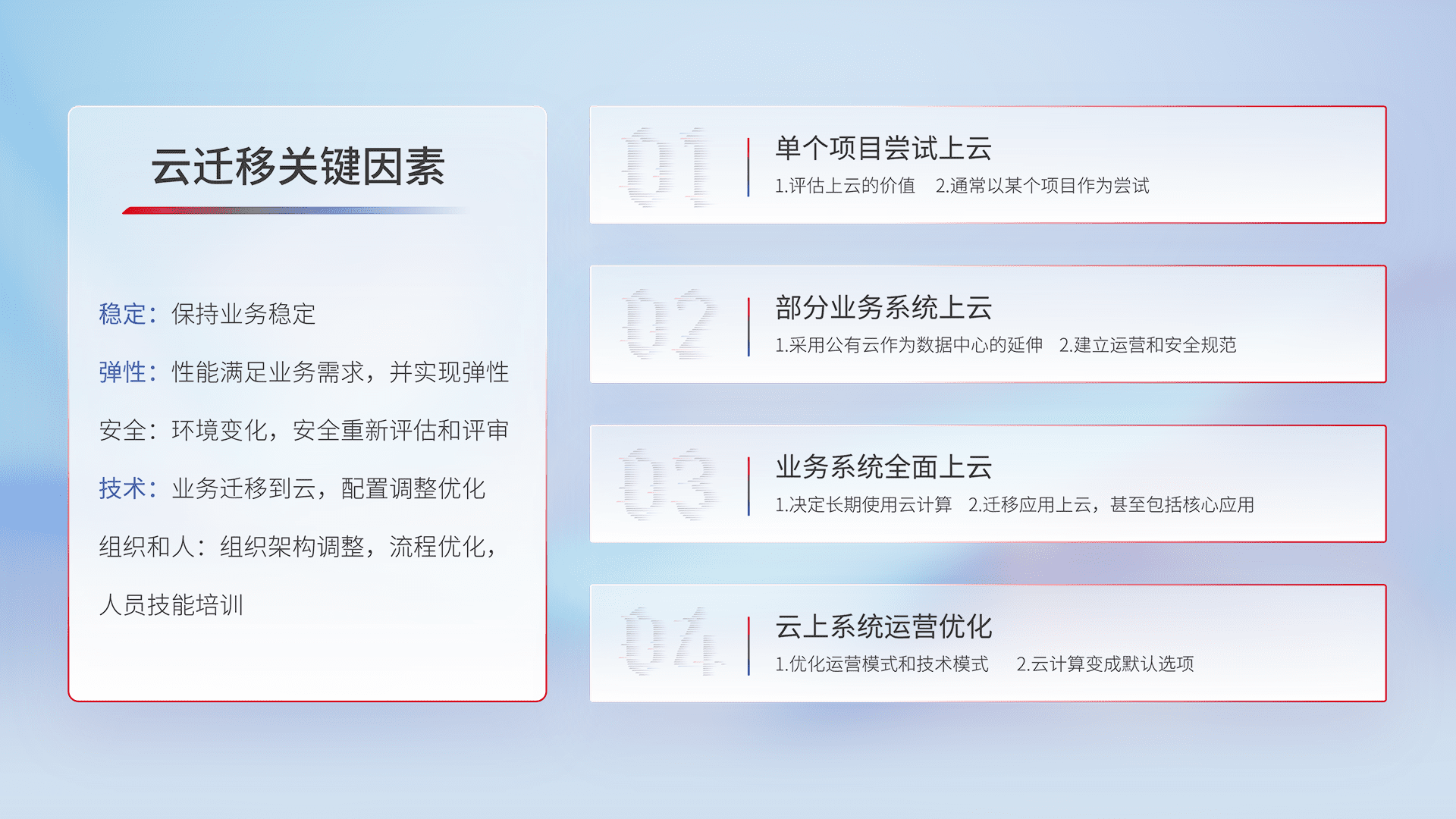结合实际业务,,从规划设计、、、、云平台选型、、、云原生改造、、数据迁移、、集成交付,,,迁移全过程为客户识别最佳上云路径,,,,做好风险识别管理,,,设计网络架构、、身份权限、、安全审计合规、、、、操作审计、、、、日志审计、、、监控告警策略、、多站点容灾设计等,,,对云上基础设施进行整体规划,,,提升IT治理水平,,,,以满足弹性、、高可用、、、高性能的需求。。。。
