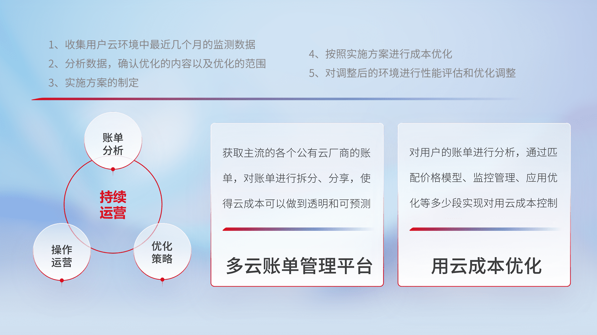 通过多云纳管,,,,以统一的资源数据模型把客户的云资源进行抽象和封装,,,进而实现对多云资源的统一操作,,,保障云资源管理的可靠性、、稳定性与可用性。。。量身定制化运维内容,,配置、、开发运维、、补丁管理、、备份、、、监控、、认证和访问管理、、、审计和日常巡检等,,保障在用云过程中的可靠度,,,,稳定度以及高可用率。。。。